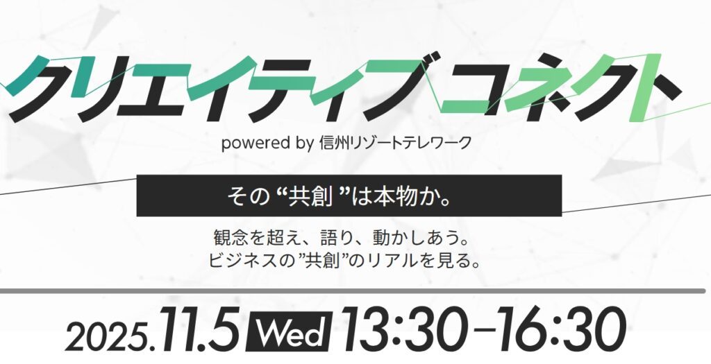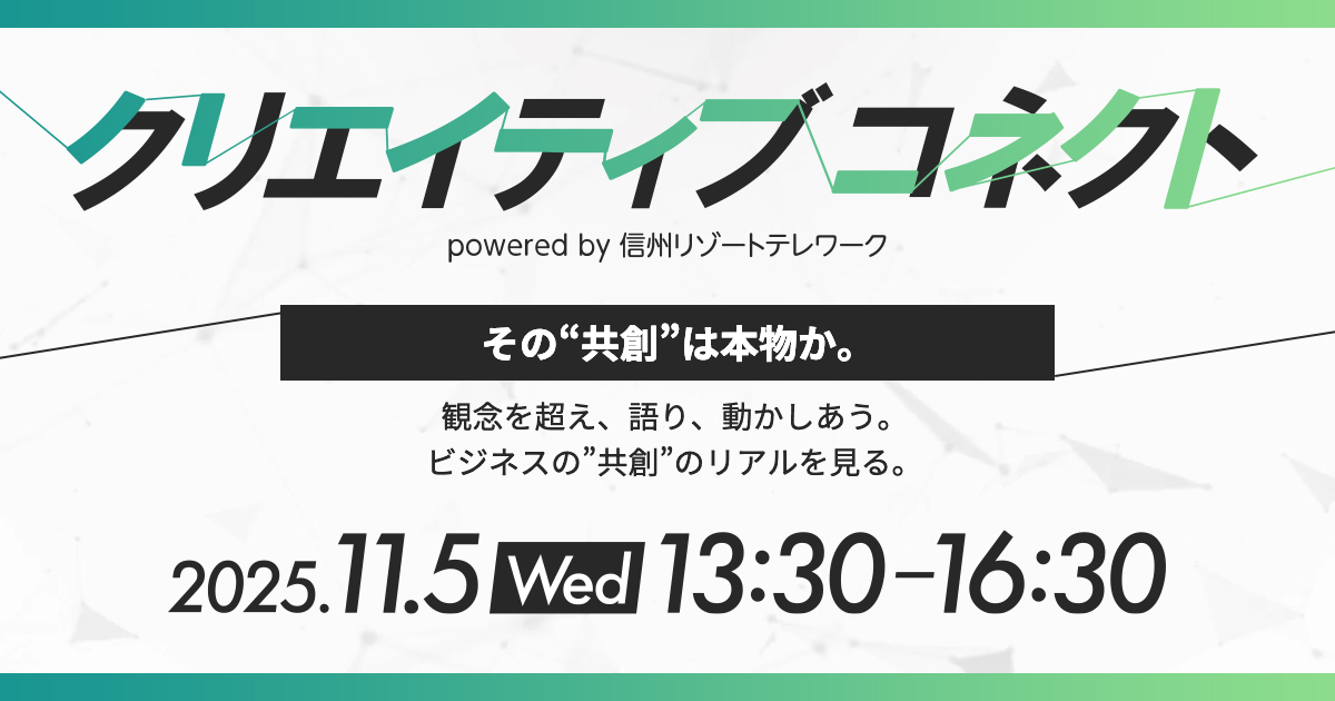 信州で新しいライフワークを提案する信州リゾートテレワーク主催のビジネスカンファレンス。“リアルな共創“をテーマに人とアイデアが交差するトークセッションが繰り広げられます。