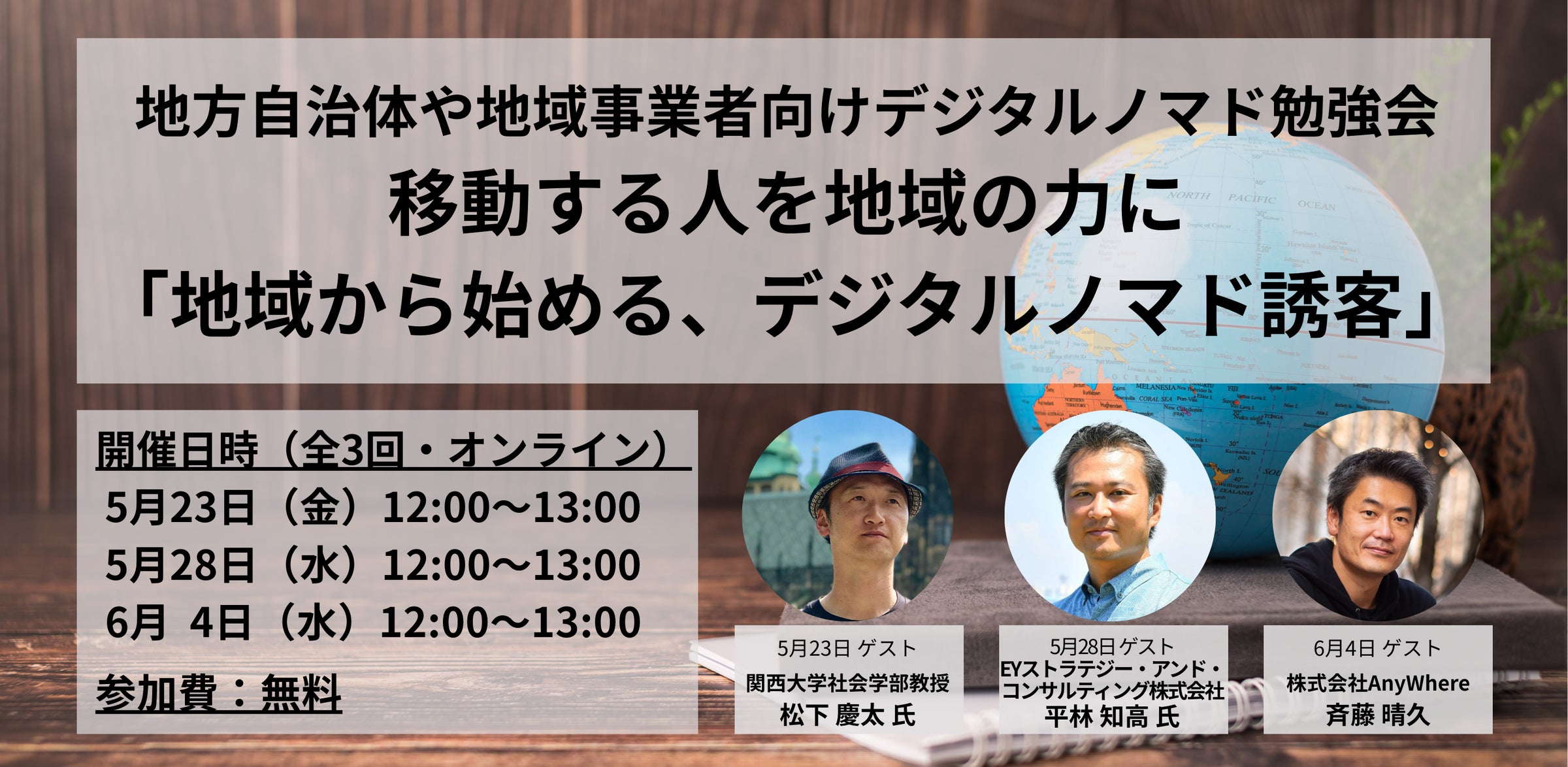 こうした背景から同社は関係人口創出、新しい働き方の普及に関する調査研究および伴走支援事業を推進してきた知見をもとに、有識者をゲストスピーカーに迎えたデジタルノマド誘客に関する勉強会を、全3回にわたり開催することになりました。